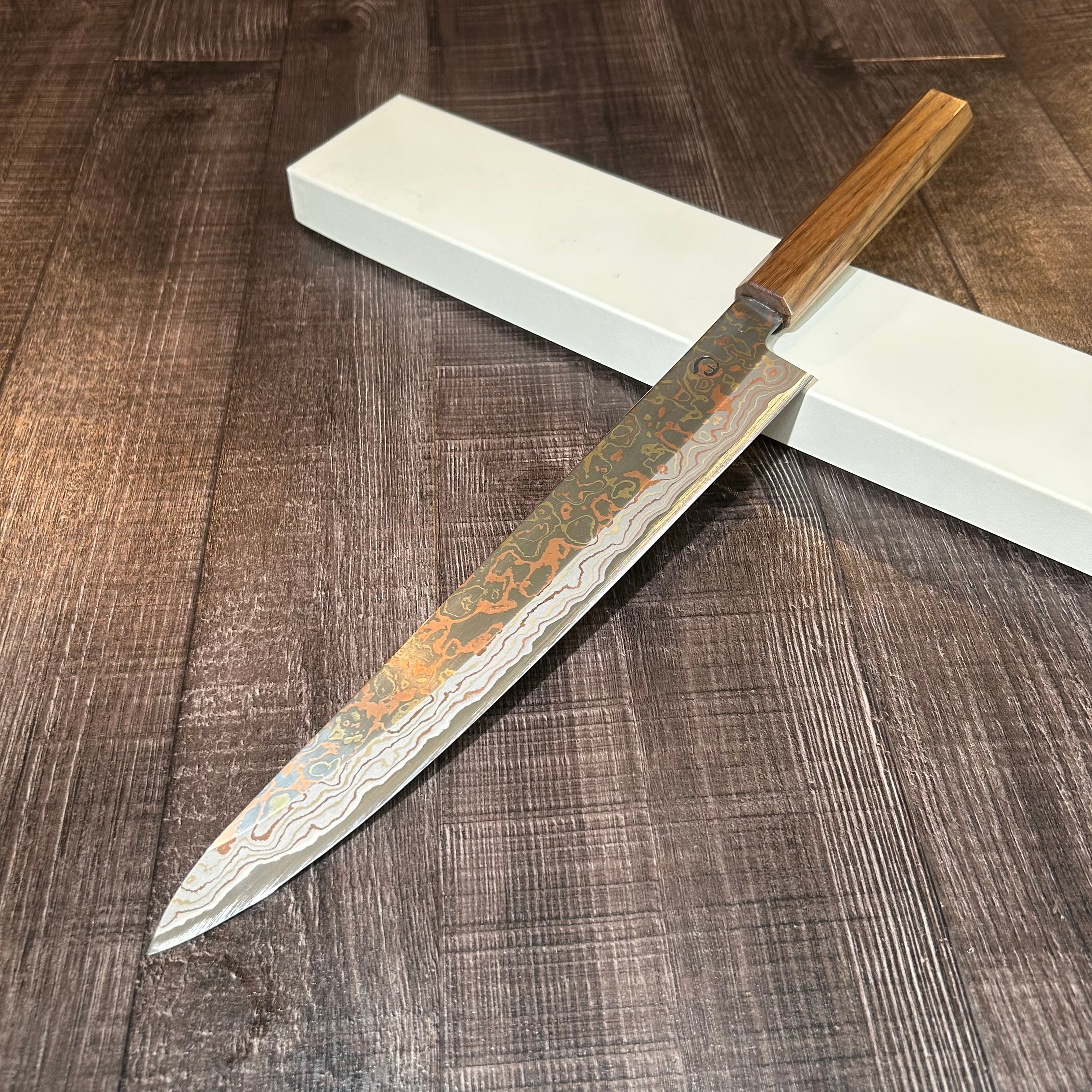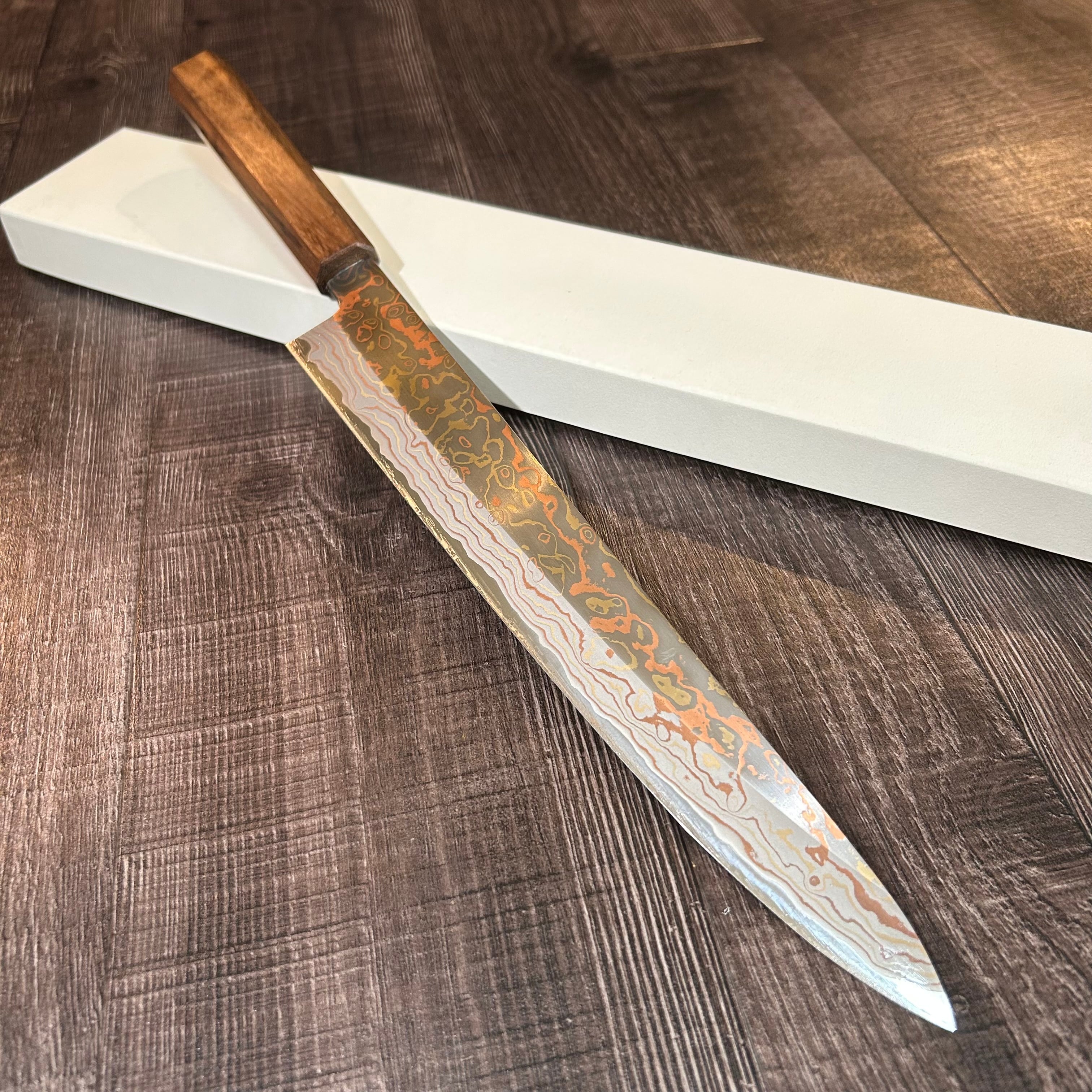 " Mutsumi Hinoura" Sujihiki 270mm V-toku#2 Rainbow Damascus Walnut handle