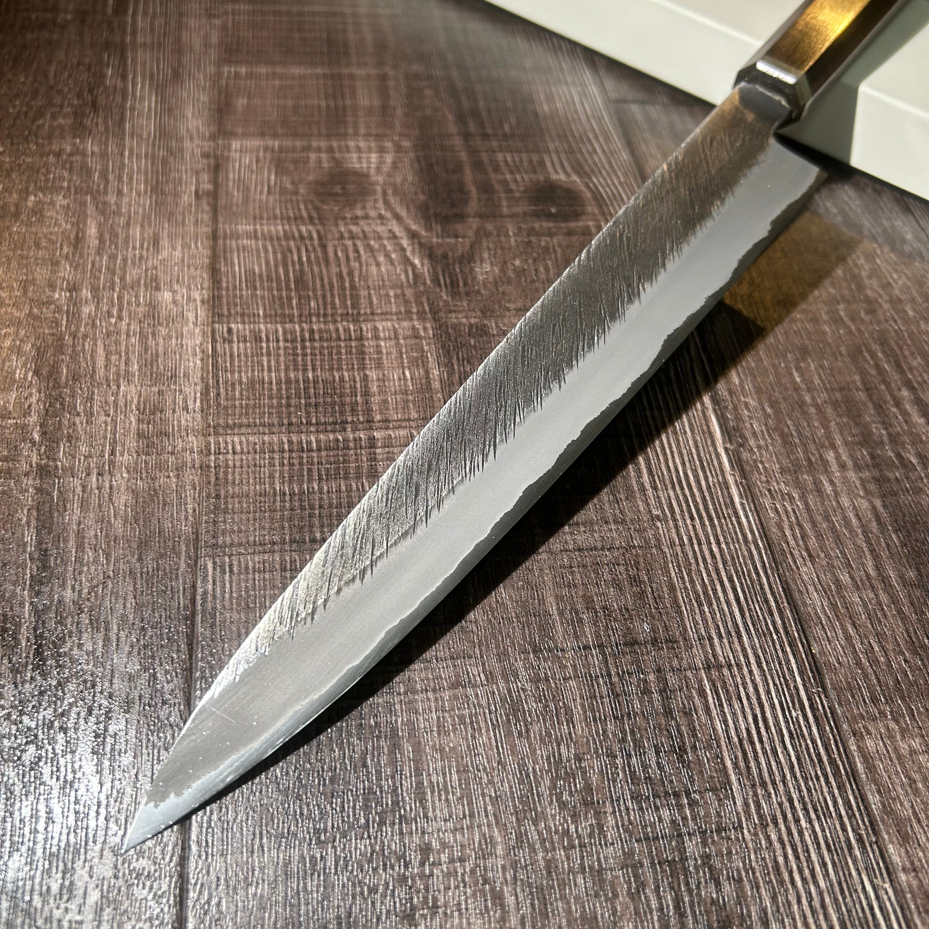 This knife has excellent sharpness, but because it is made of carbon steel, it is prone to rust. During use, wipe off moisture frequently, wash the knife after use, and dry it thoroughly.