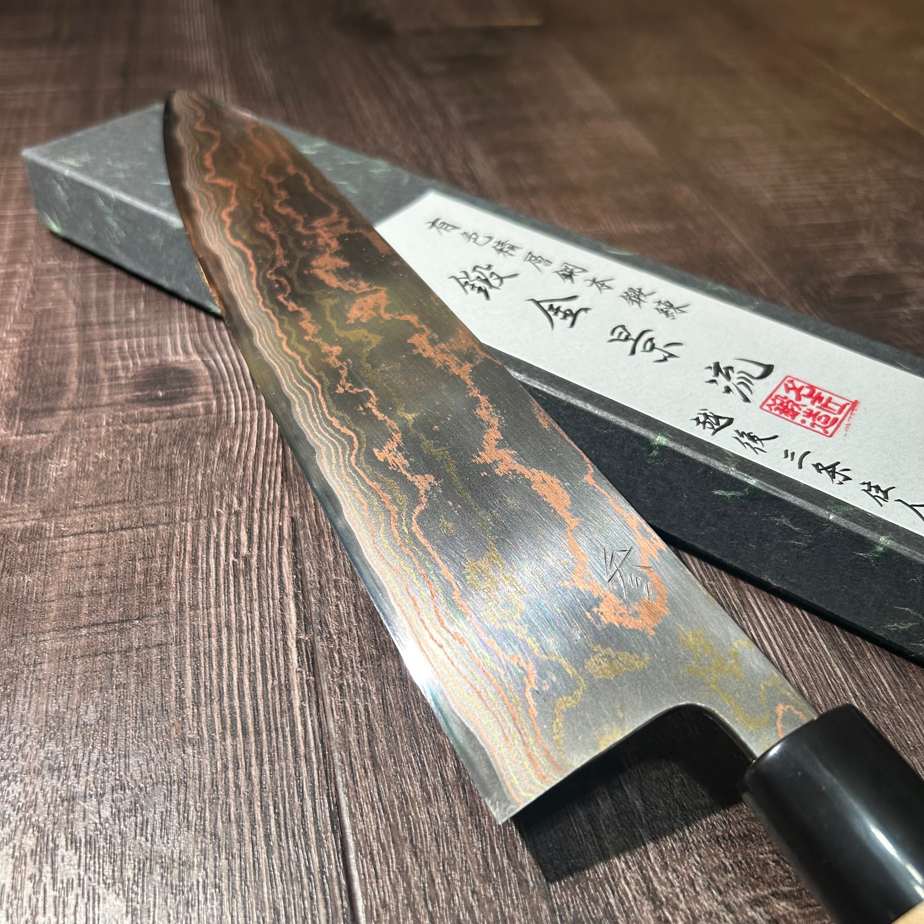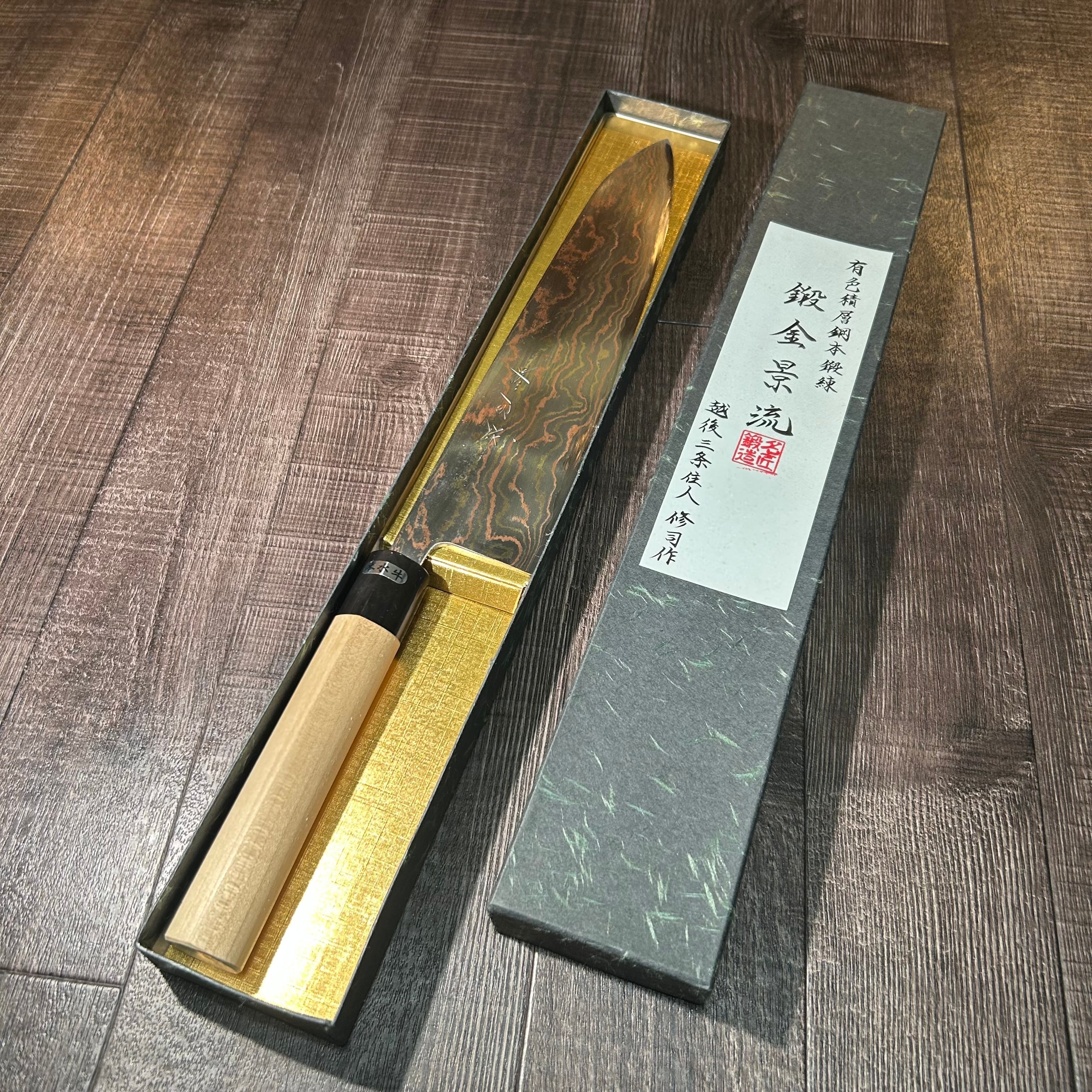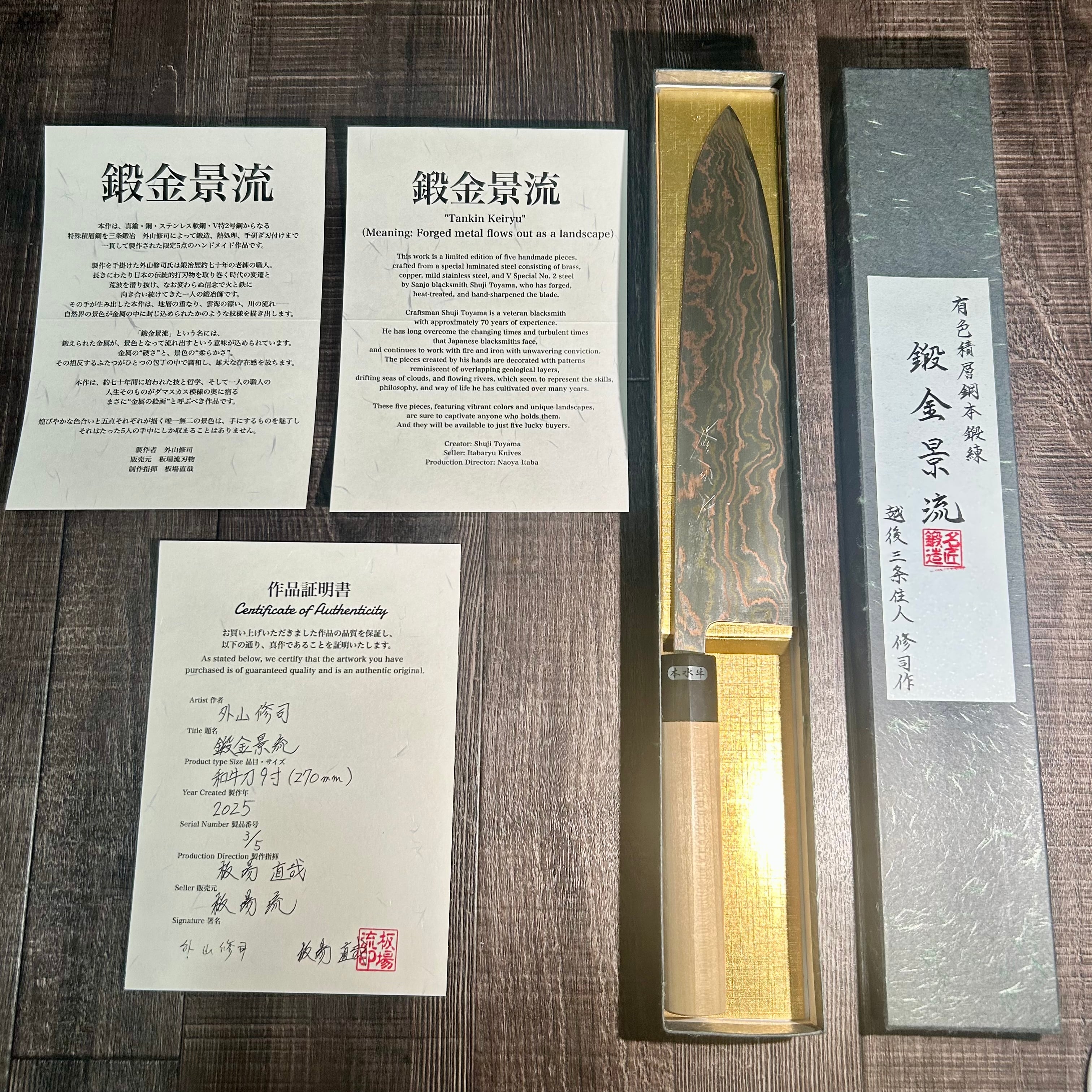 This work is a limited edition of only five handmade pieces, crafted from a special laminated steel composed of brass, copper, mild stainless steel, and V Special No. 2 steel. Each blade is forged, heat-treated, and hand-sharpened by Sanjo blacksmith Shuji Toyama.