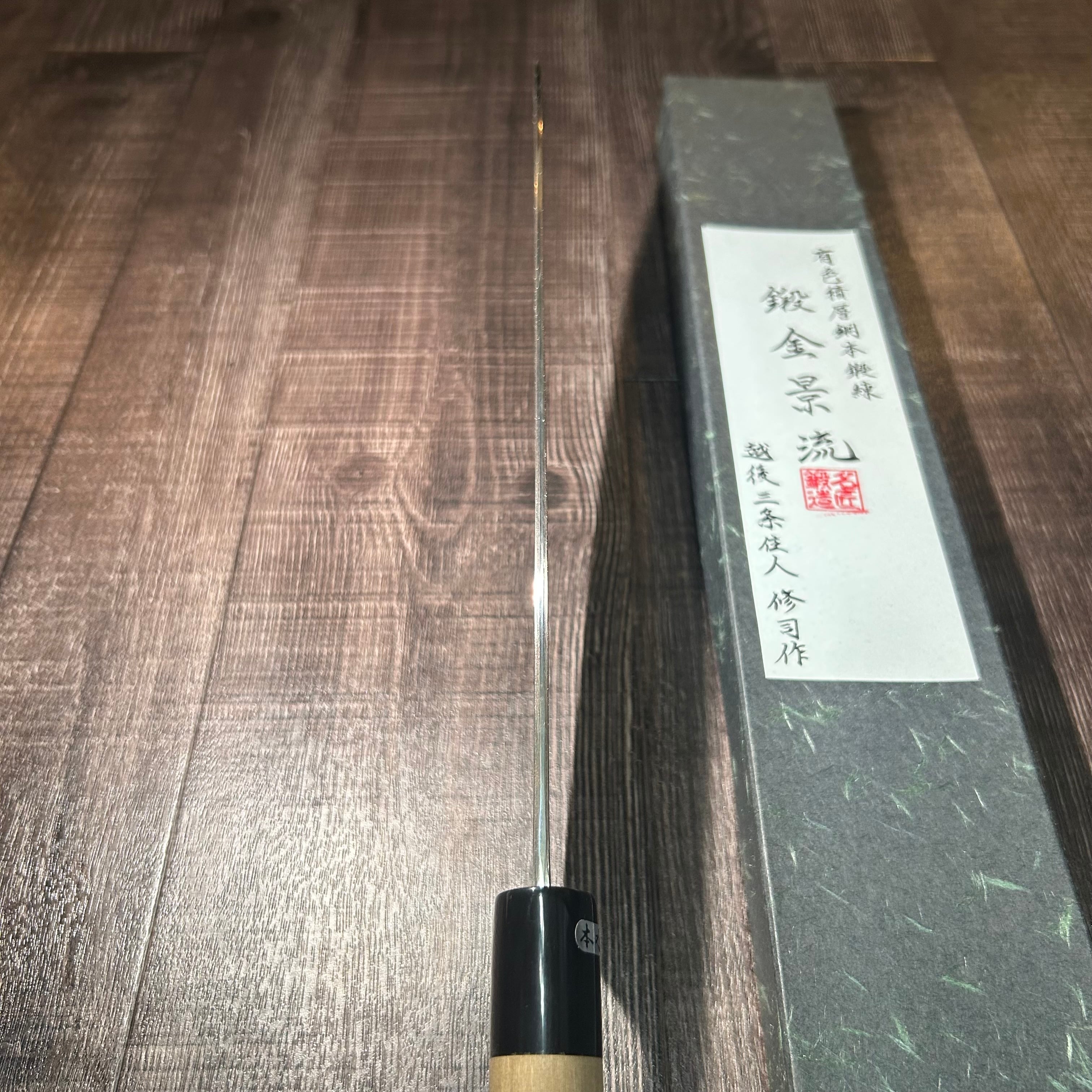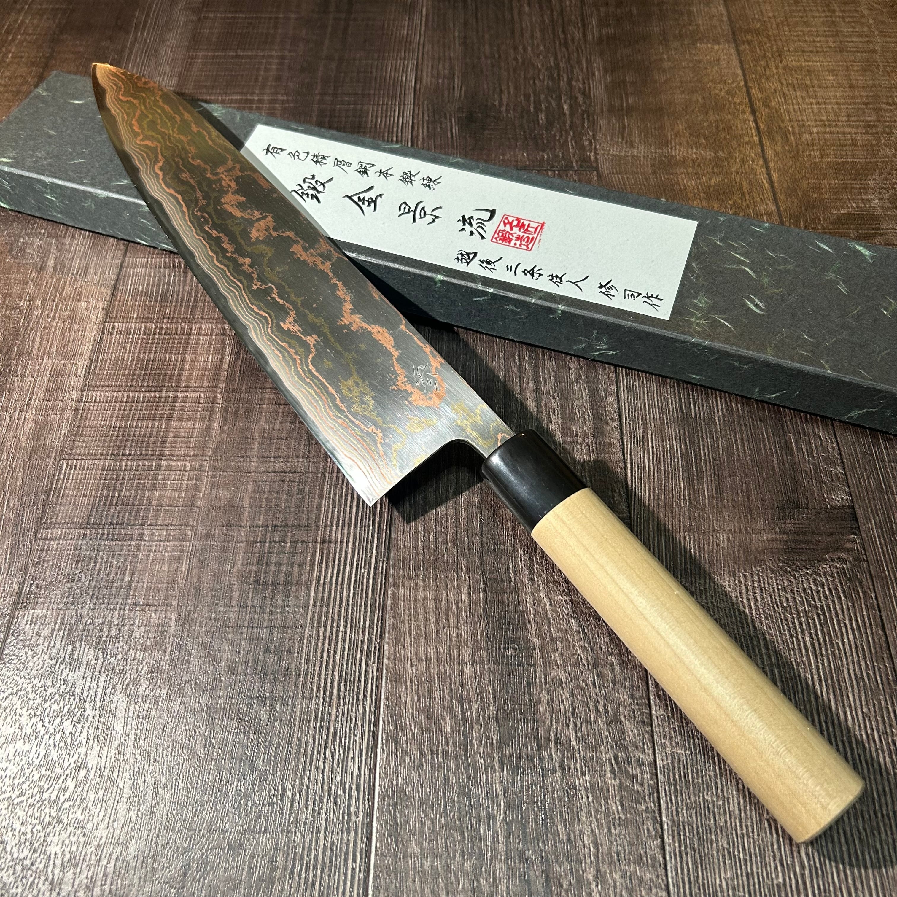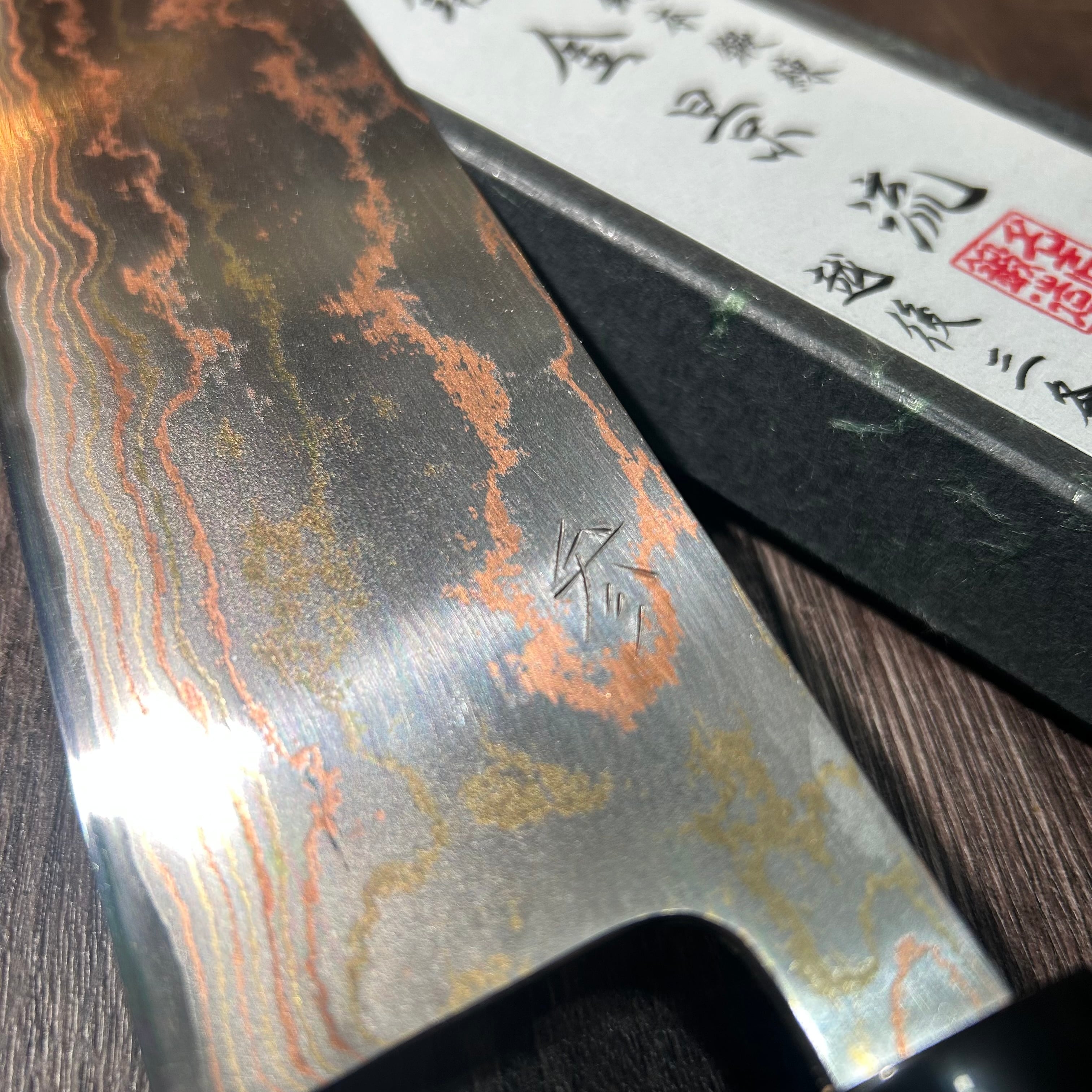 This work is a limited edition of only five handmade pieces, crafted from a special laminated steel composed of brass, copper, mild stainless steel, and V Special No. 2 steel. Each blade is forged, heat-treated, and hand-sharpened by Sanjo blacksmith Shuji Toyama.
