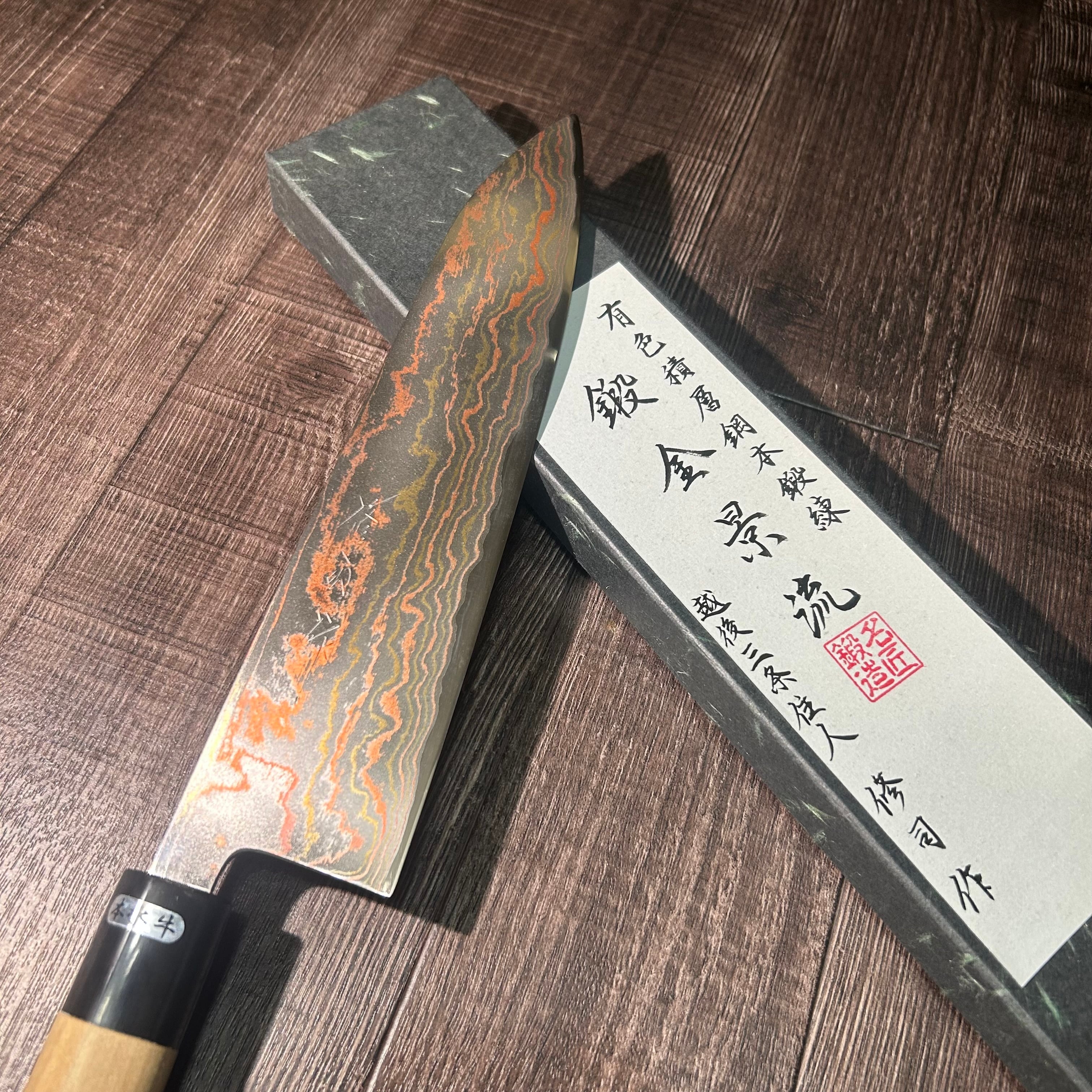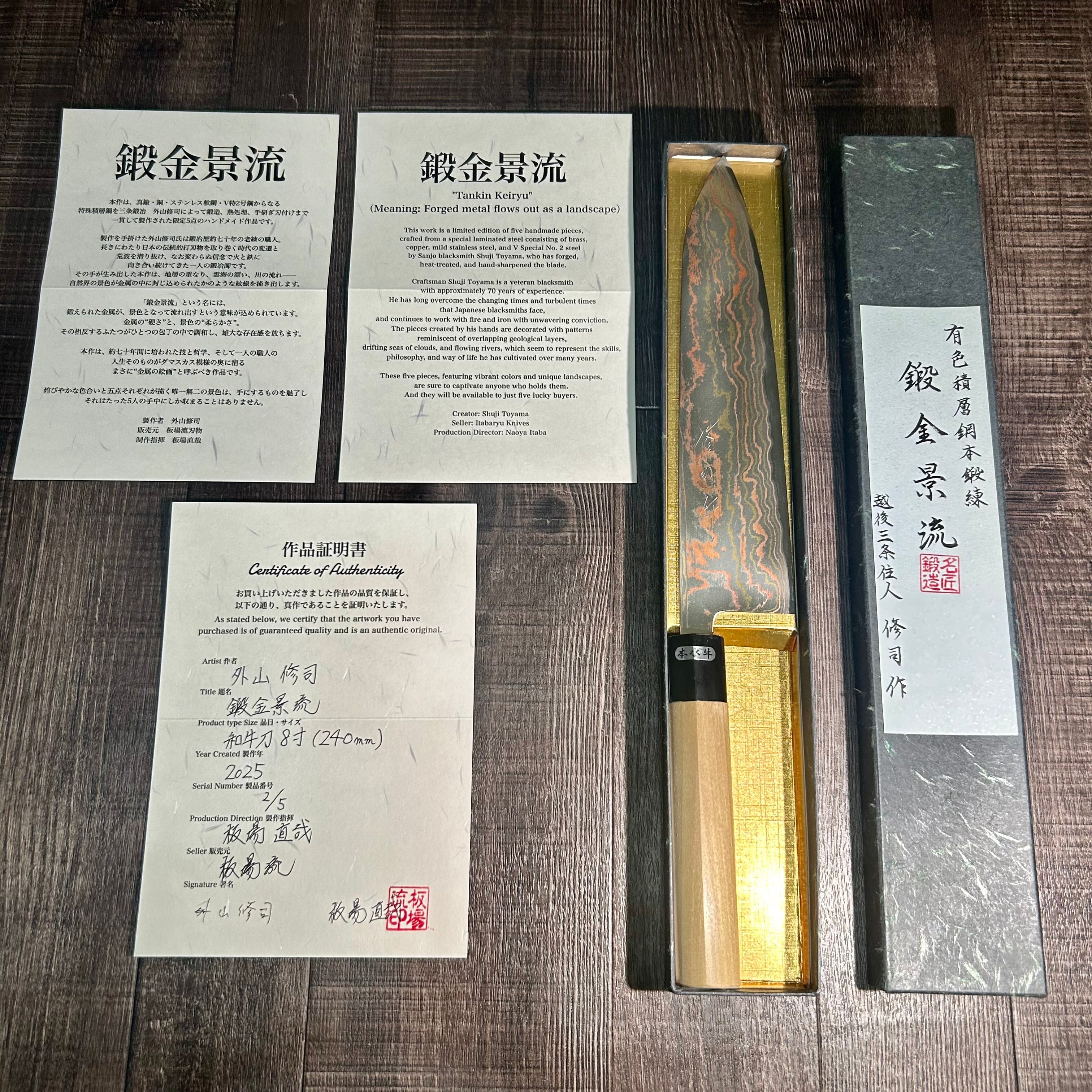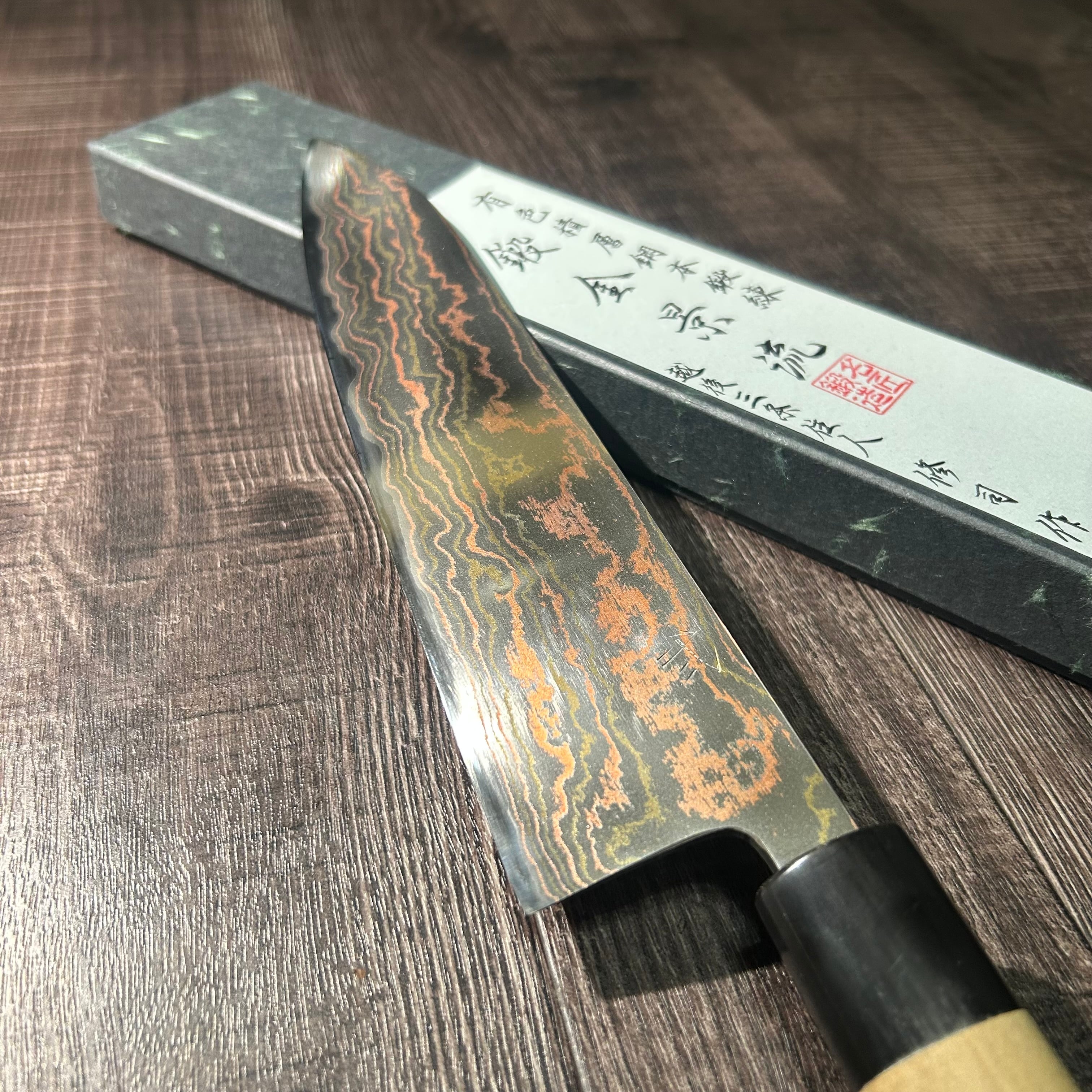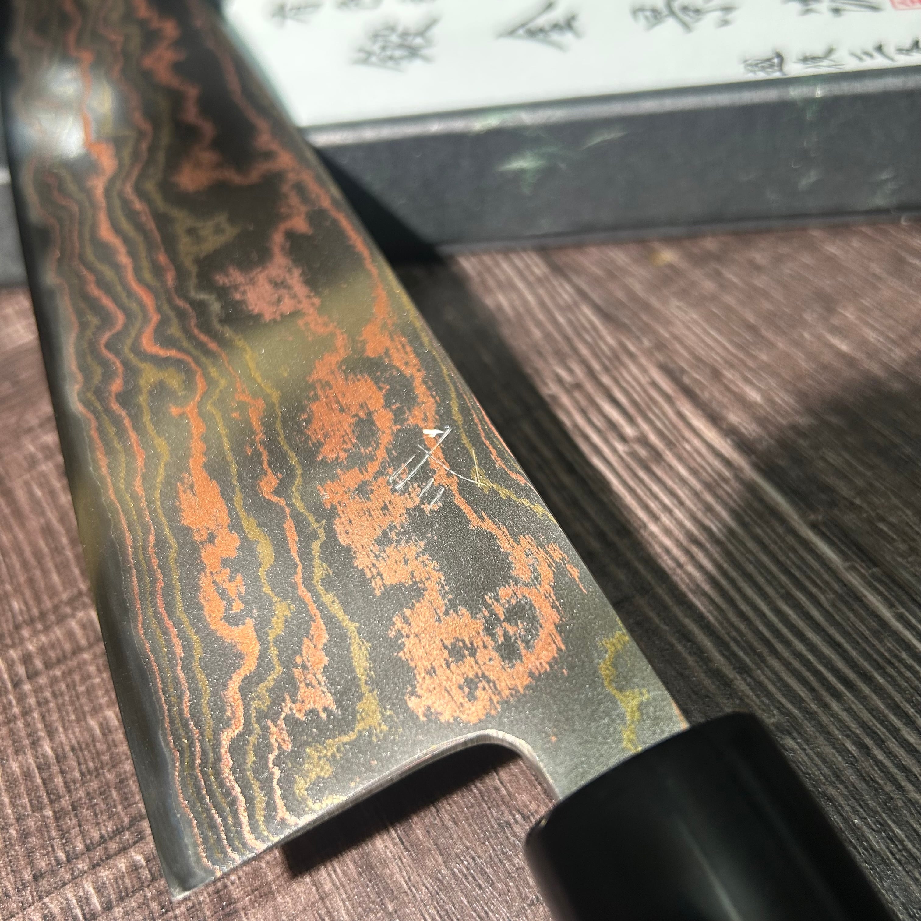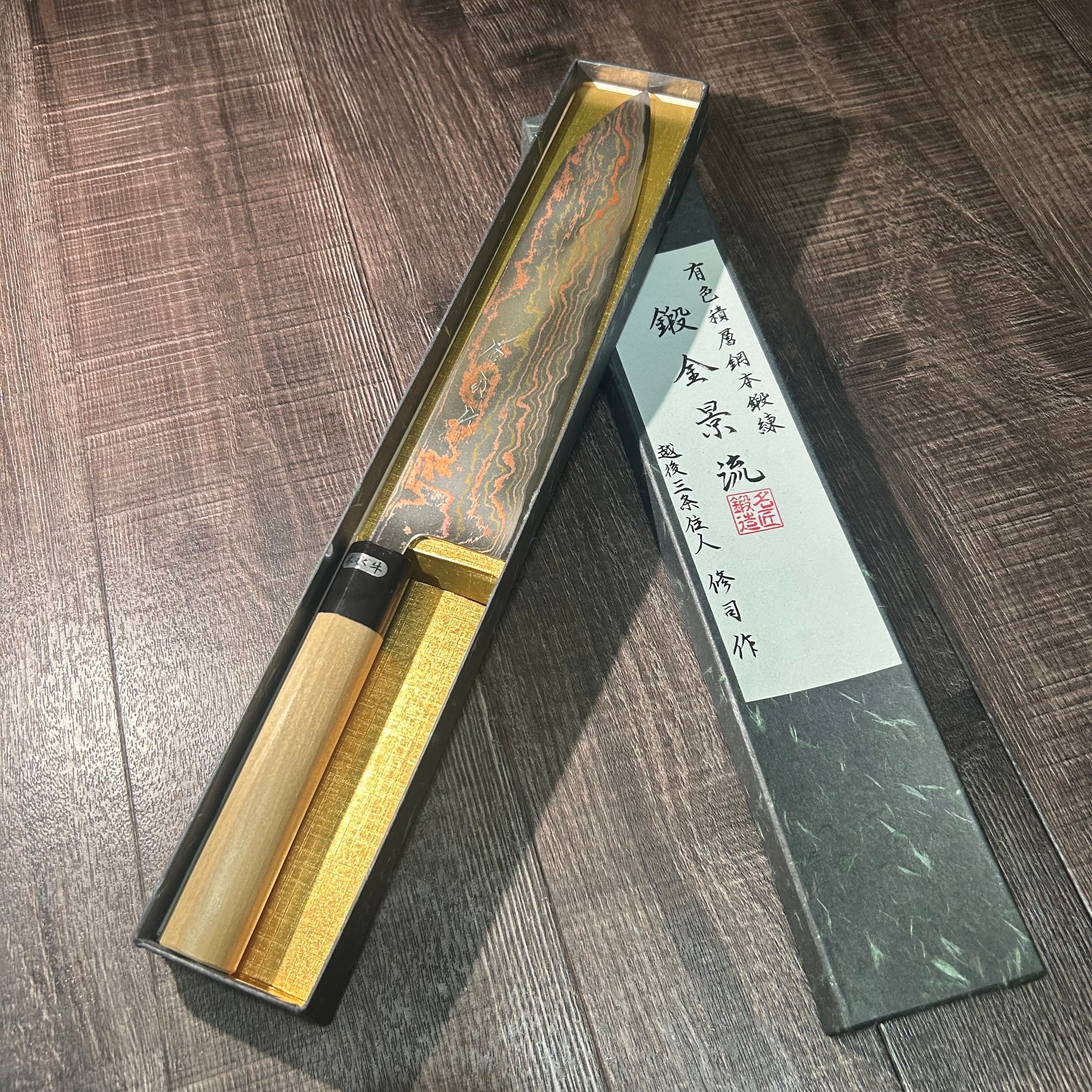 This work is a limited edition of only five handmade pieces, crafted from a special laminated steel composed of brass, copper, mild stainless steel, and V Special No. 2 steel. Each blade is forged, heat-treated, and hand-sharpened by Sanjo blacksmith Shuji Toyama.