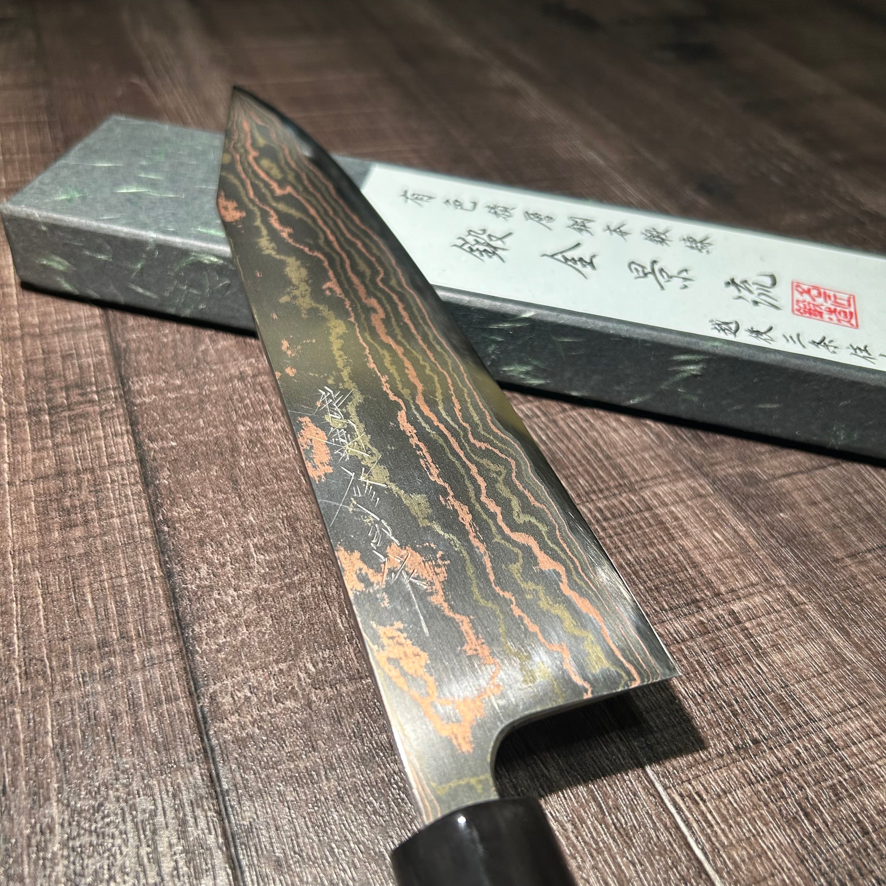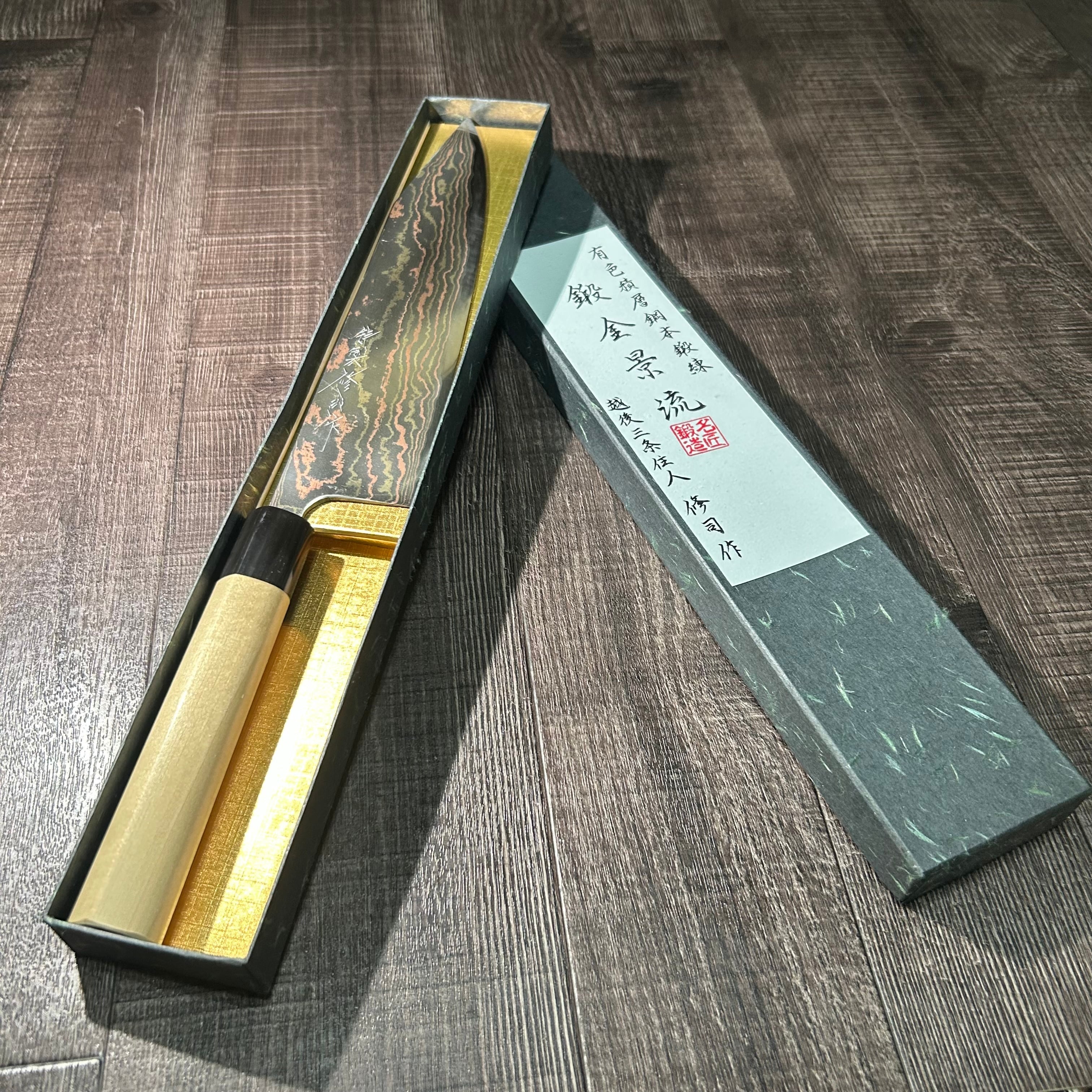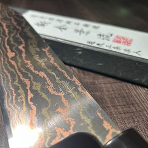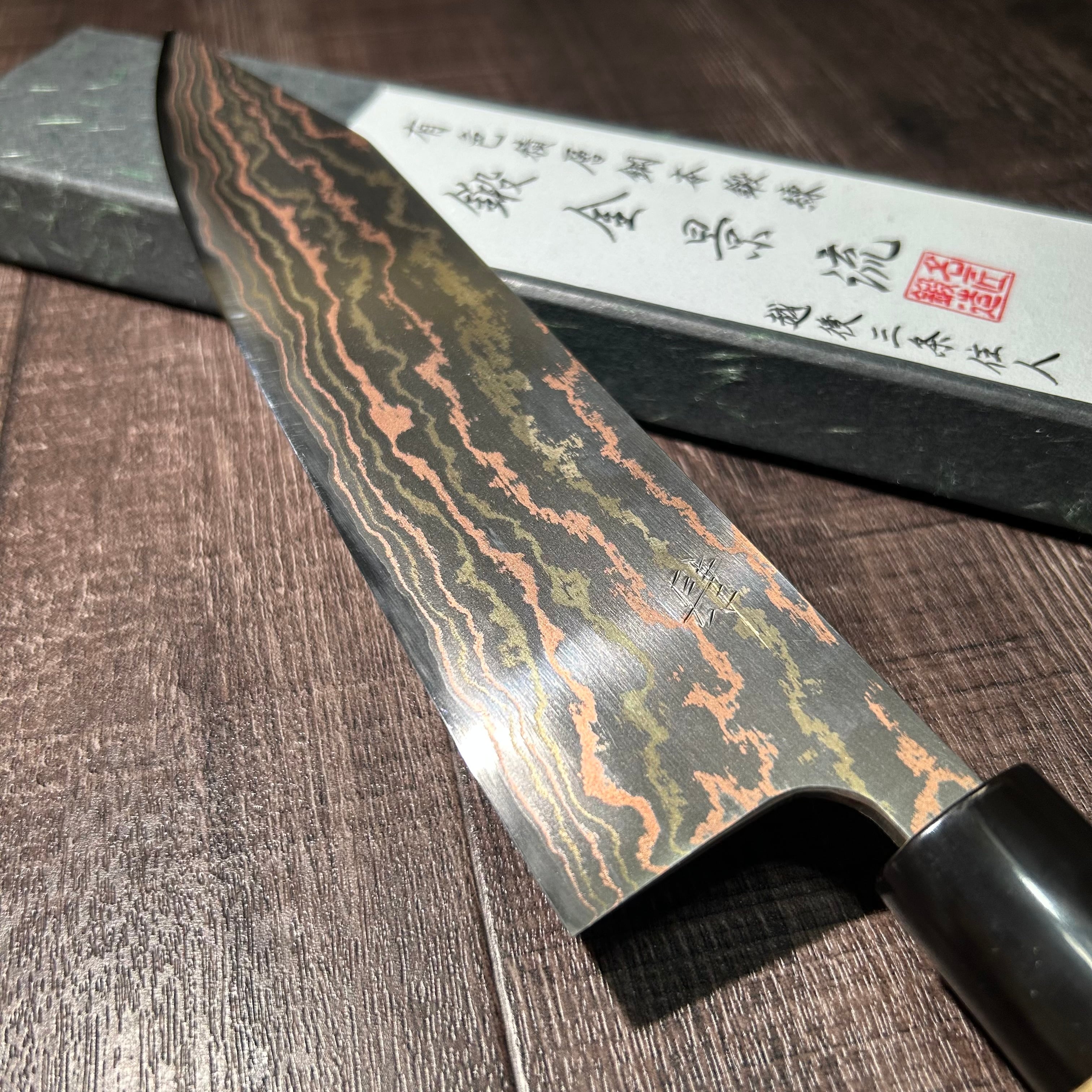 This work is a limited edition of only five handmade pieces, crafted from a special laminated steel composed of brass, copper, mild stainless steel, and V Special No. 2 steel. Each blade is forged, heat-treated, and hand-sharpened by Sanjo blacksmith Shuji Toyama.