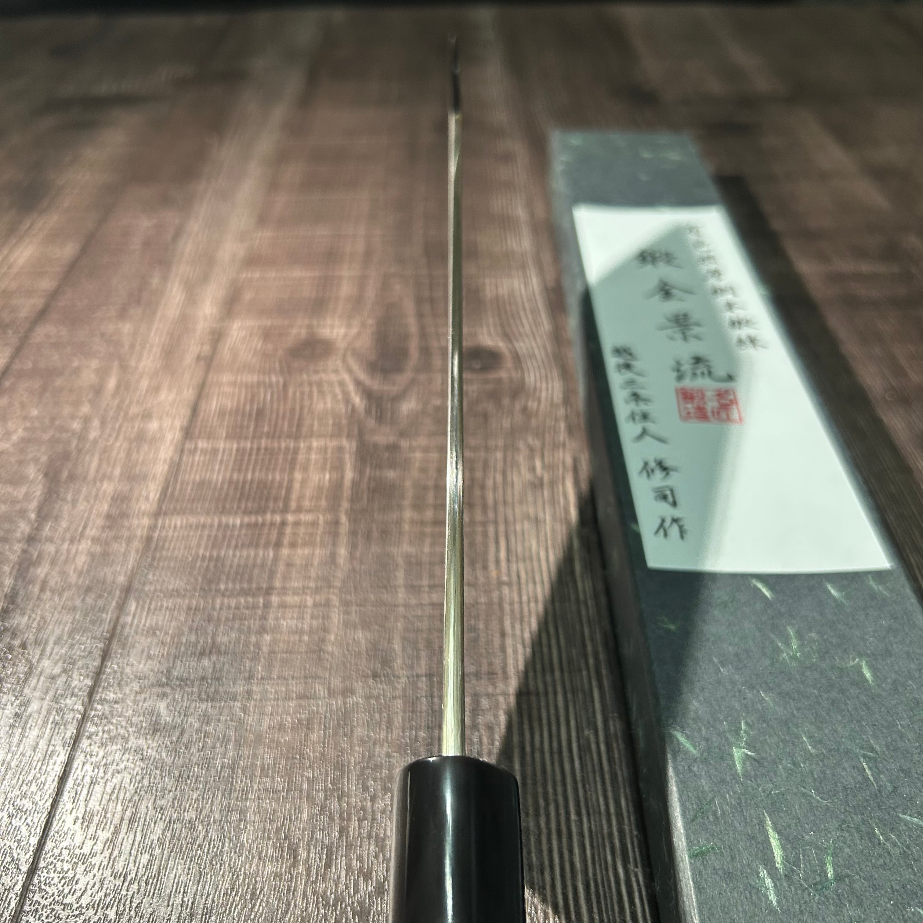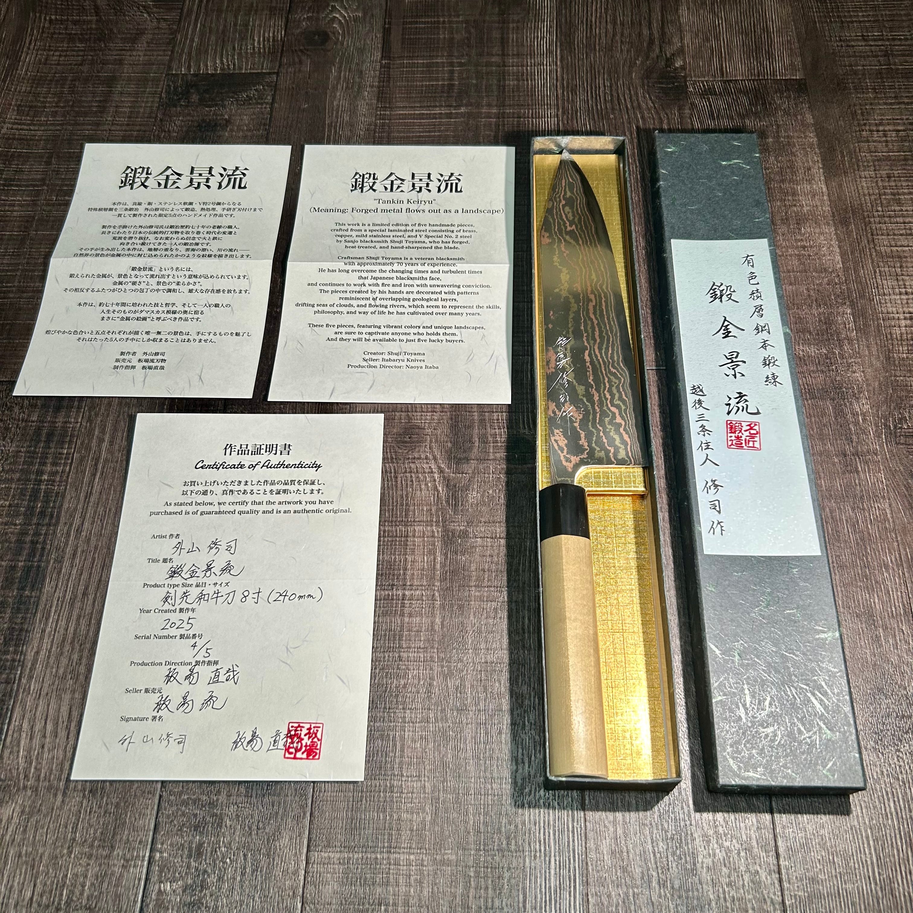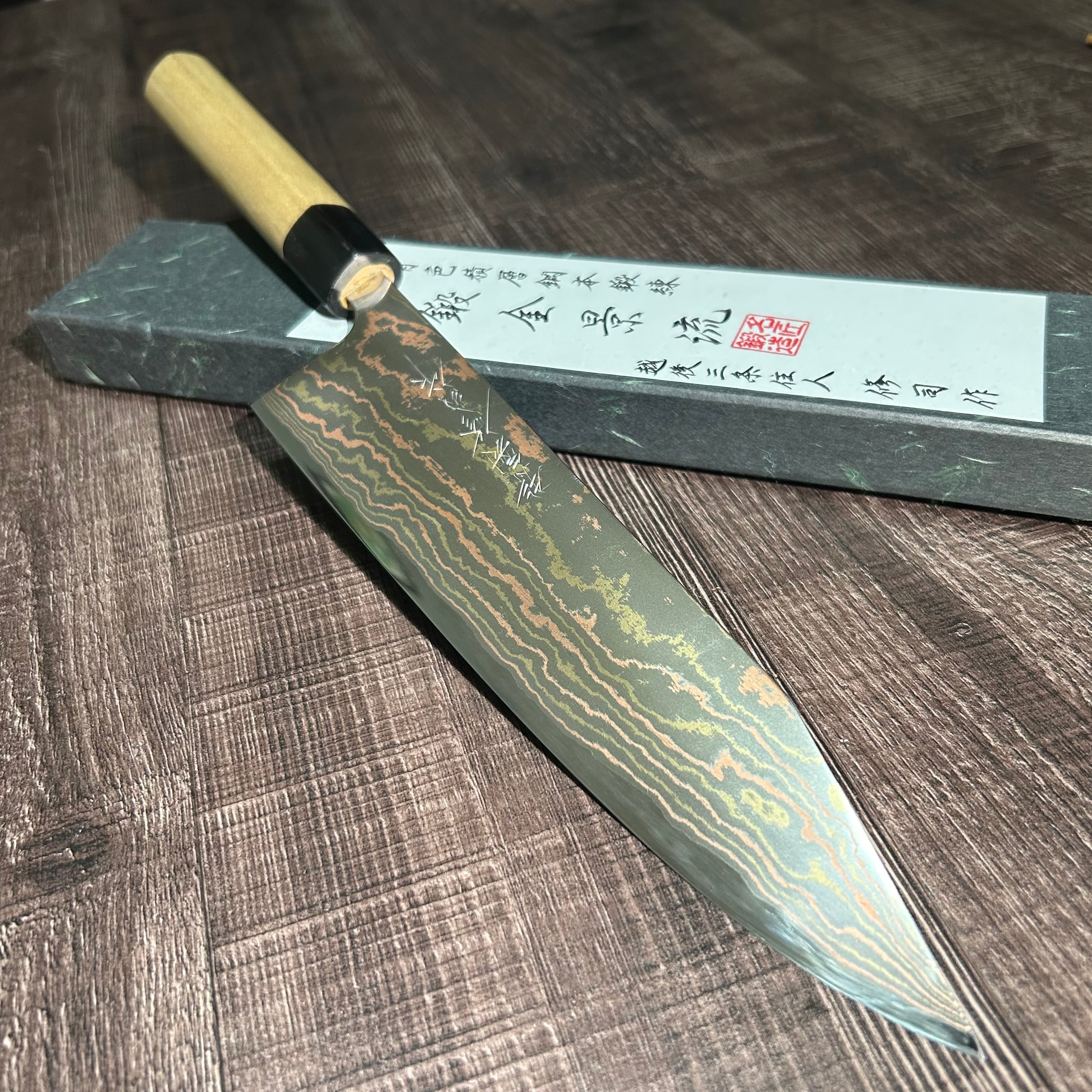 This work is a limited edition of only five handmade pieces, crafted from a special laminated steel composed of brass, copper, mild stainless steel, and V Special No. 2 steel. Each blade is forged, heat-treated, and hand-sharpened by Sanjo blacksmith Shuji Toyama.
