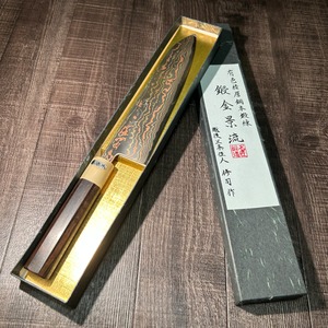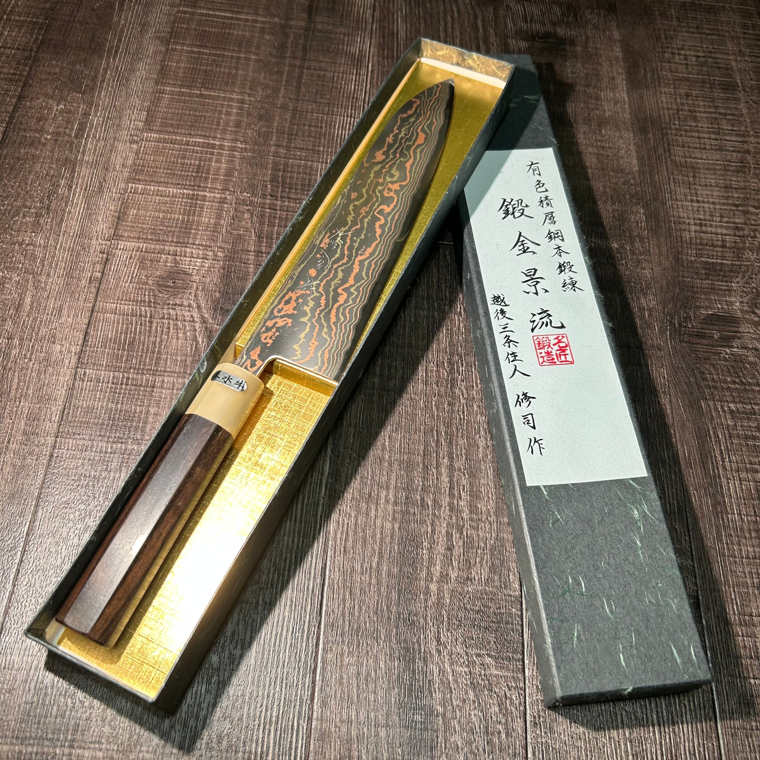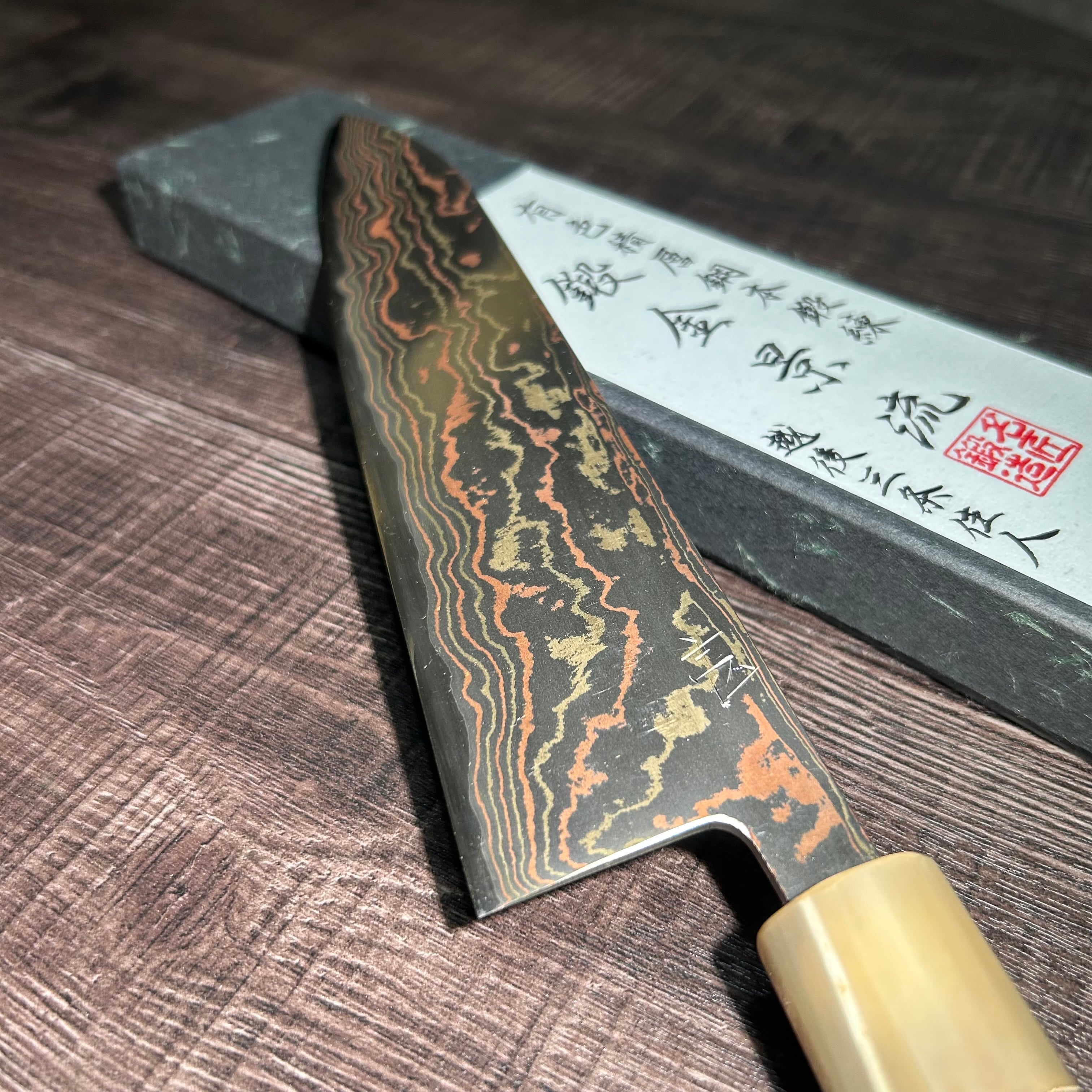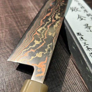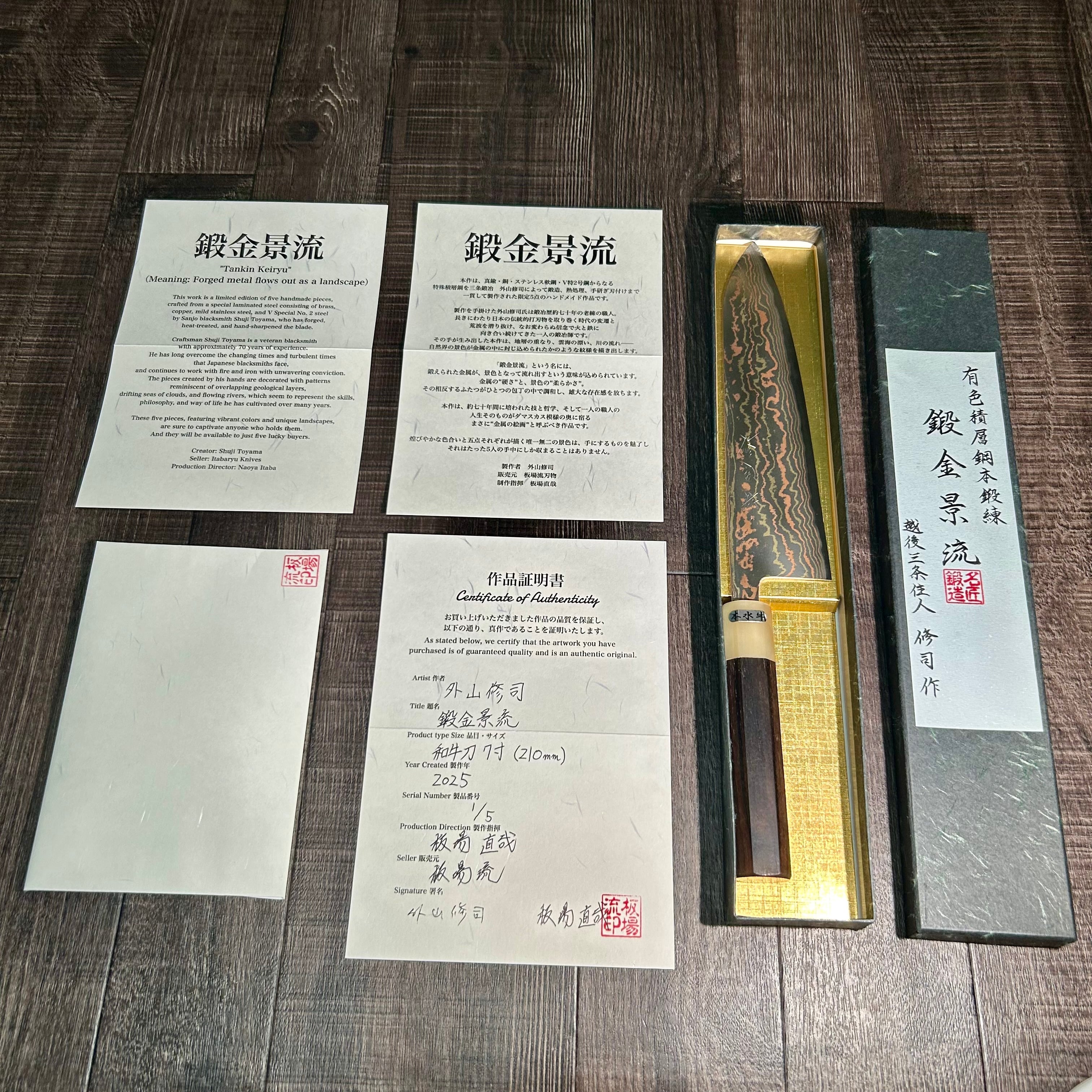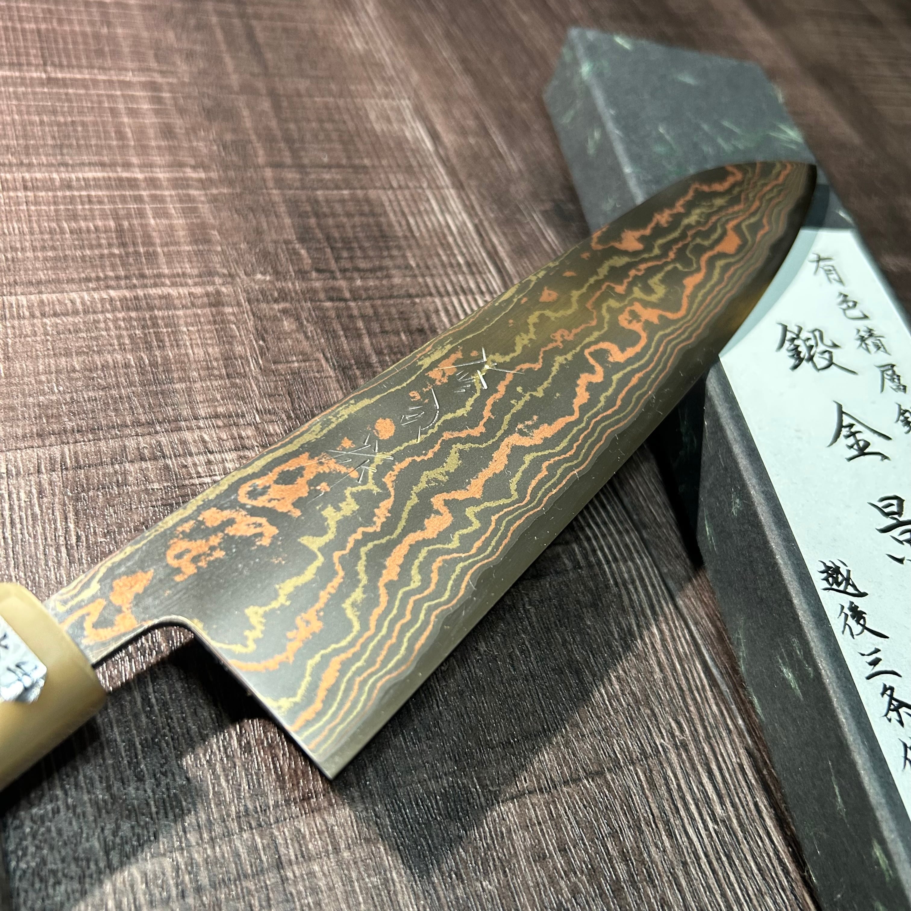 This work is a limited edition of only five handmade pieces, crafted from a special laminated steel composed of brass, copper, mild stainless steel, and V Special No. 2 steel. Each blade is forged, heat-treated, and hand-sharpened by Sanjo blacksmith Shuji Toyama.